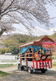 石座神社の例大祭や鶴巻温泉春まつりなどで10年以上前から太鼓の演奏を披露している同会。今年は、コロナ禍で休止していた山車も復活した。当日、太鼓を乗せた車が神社周辺を巡回して太鼓の音を響かせた。「桜も見頃で良い日に演奏できた」と同会は話す。