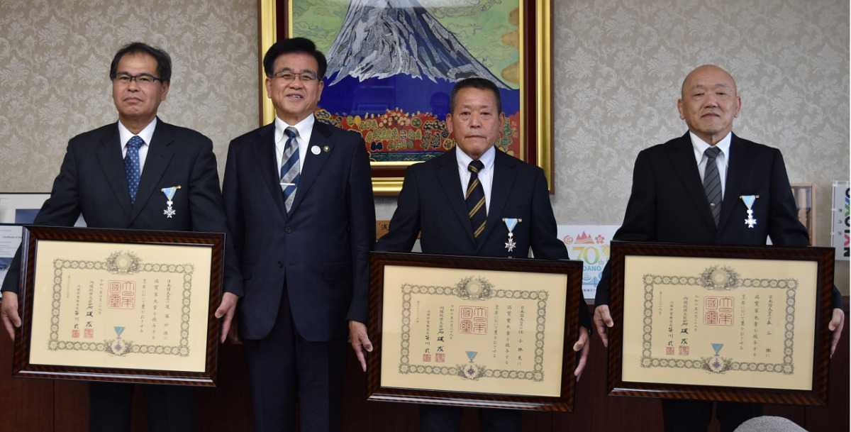 受章報告で、3人は高橋市長にこれまでの経験などを交え、受章の喜びや伝達式などでの思い出を語った。