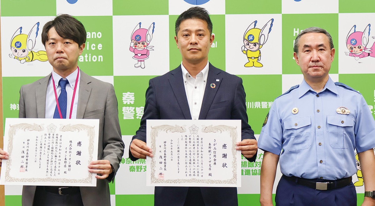 また同日、特殊詐欺の被害を未然に防いだとして、さがみ信用金庫秦野駅プラザ支店の杉川裕也代表とイオン銀行秦野店の橋本明日可(あすか)副店長に感謝状の贈呈も行われた。浅田二郎署長は2人に感謝状を手渡し、金融窓口が特殊詐欺を防ぐ最後の砦であることに感謝を示した。浅田署長は「特殊詐欺の手口は多様化しており、最近は無人ATMを使われるパターンも増えてきている。どんな手口があるのかを知っていただき、被害に遭わないよう気を付けてほしい」と話した。