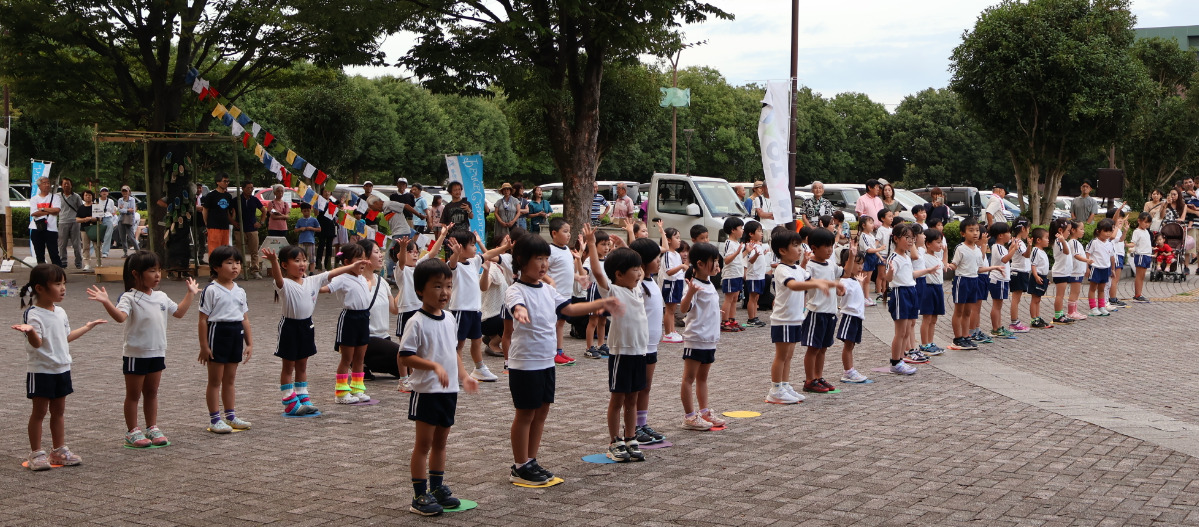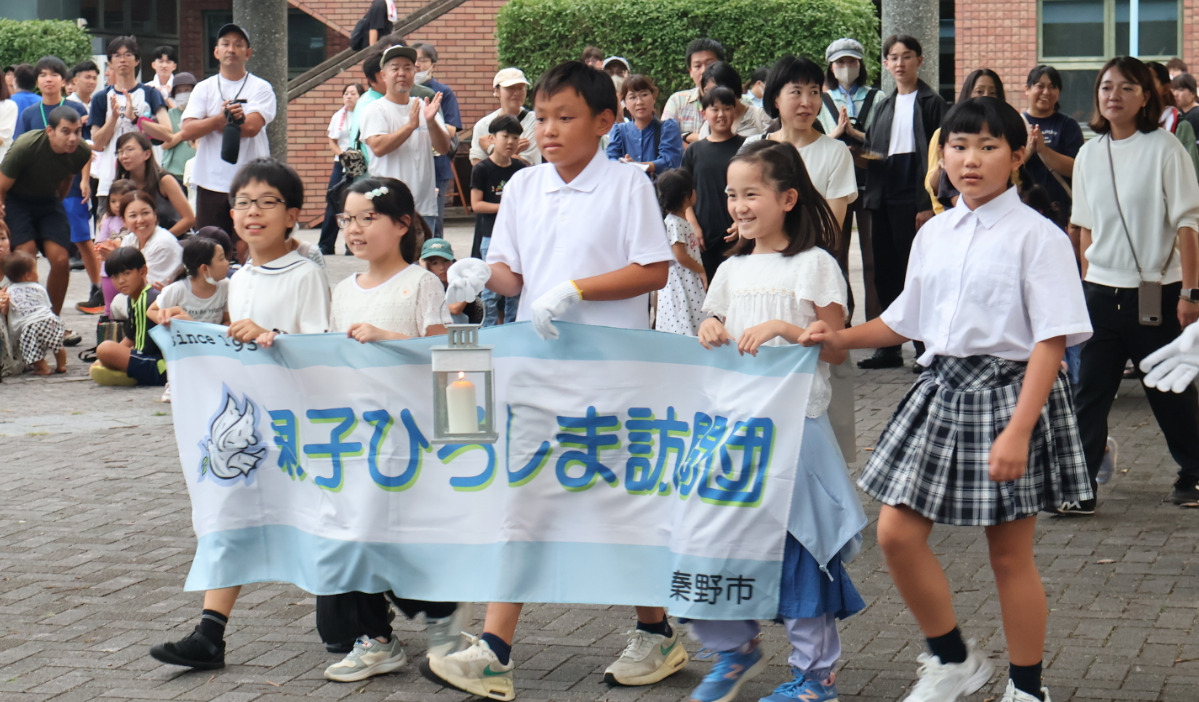 オープニングを飾ったのは本町・南・東・北・西幼稚園の園児による市制50周年記念歌「With you ありがとう」の手話コーラス。続いて、「親子ひろしま訪問団」のメンバーが「平和の灯」を持って入場。この「平和の灯」は、2009年に広島平和記念公園から持ち帰ったもので、秦野でも絶やさず受け継がれてきた灯がメインキャンドルへと採火された。