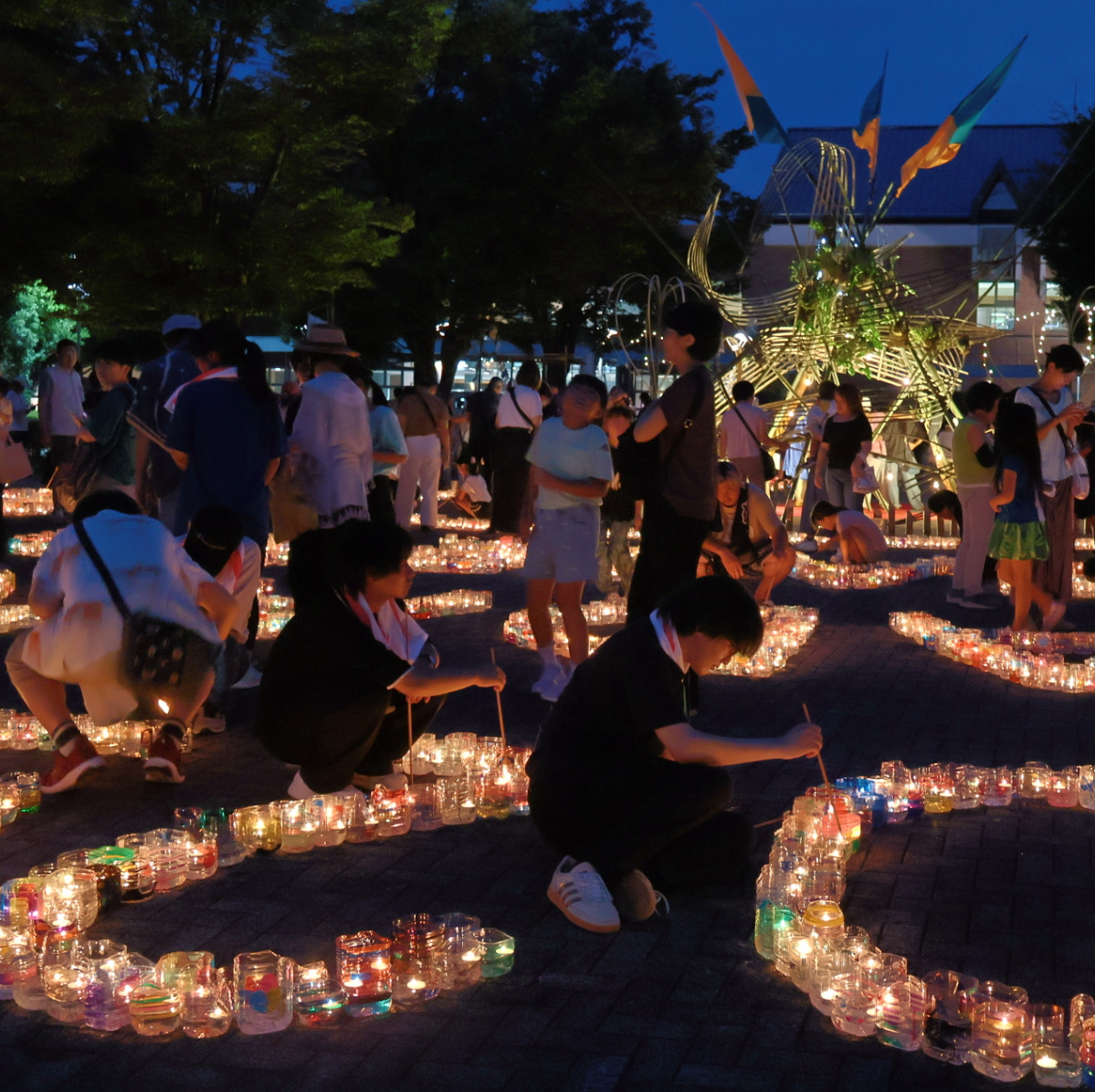 会場には親子連れなど多くの人々が集まり、メインキャンドルから採った火をピースキャンドルへ一つ一つ灯していった。日が落ちると、ピースキャンドルの明かりが暗闇の中に幻想的に浮かび上がっていた。