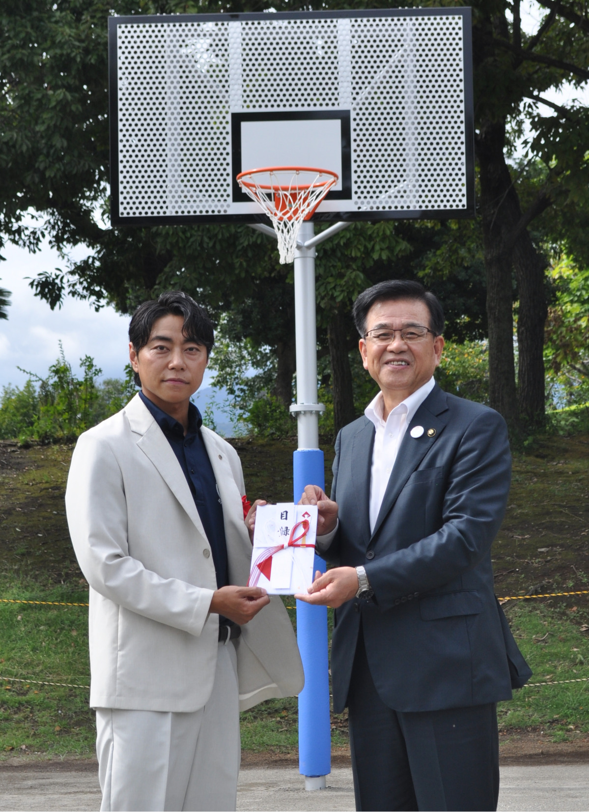 株式会社島半(秦野市鈴張町5の30/鈴木康介代表取締役社長)が9月19日、カルチャーパークスポーツ広場のバスケットゴール2台(約300万円相当)を寄贈した。当日は同広場で式典が行われ、鈴木社長が高橋昌和市長に目録を手渡した。
