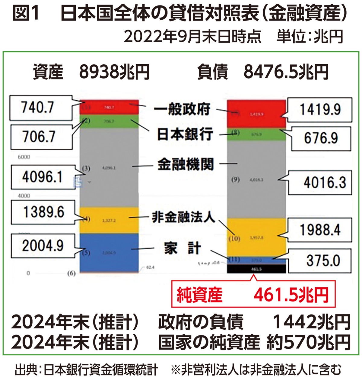 この時点で国の借金と言われる政府の負債は1419・9兆円ですが、「国全体の金融負債」は8476・5兆円、対して金融資産の合計は8938兆円です。差額の461・5兆円が「純資産」です。