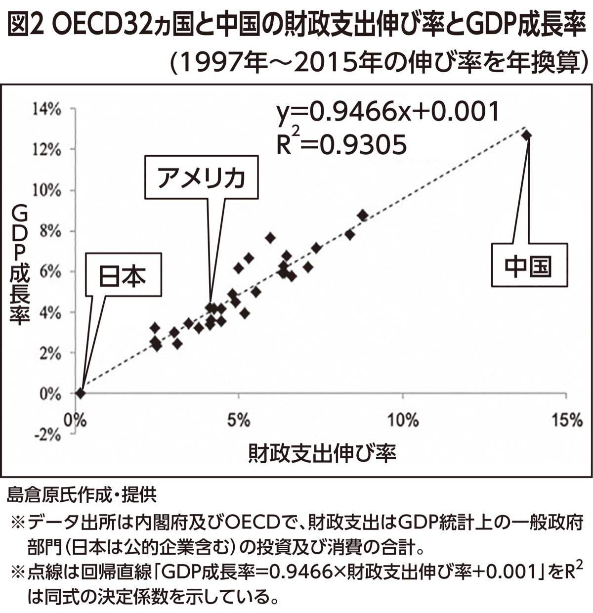 実は法人・個人の資産の多くは一部の大企業、富裕層に偏り、低収入で資産を持たず負担増によって生活が苦しい人々が増えている実態があるのです。図2は1997年を起点として、2015年までのOECD諸国と中国を加えた、各国の財政支出の伸び率とGDPの伸び率との関係を示しています。