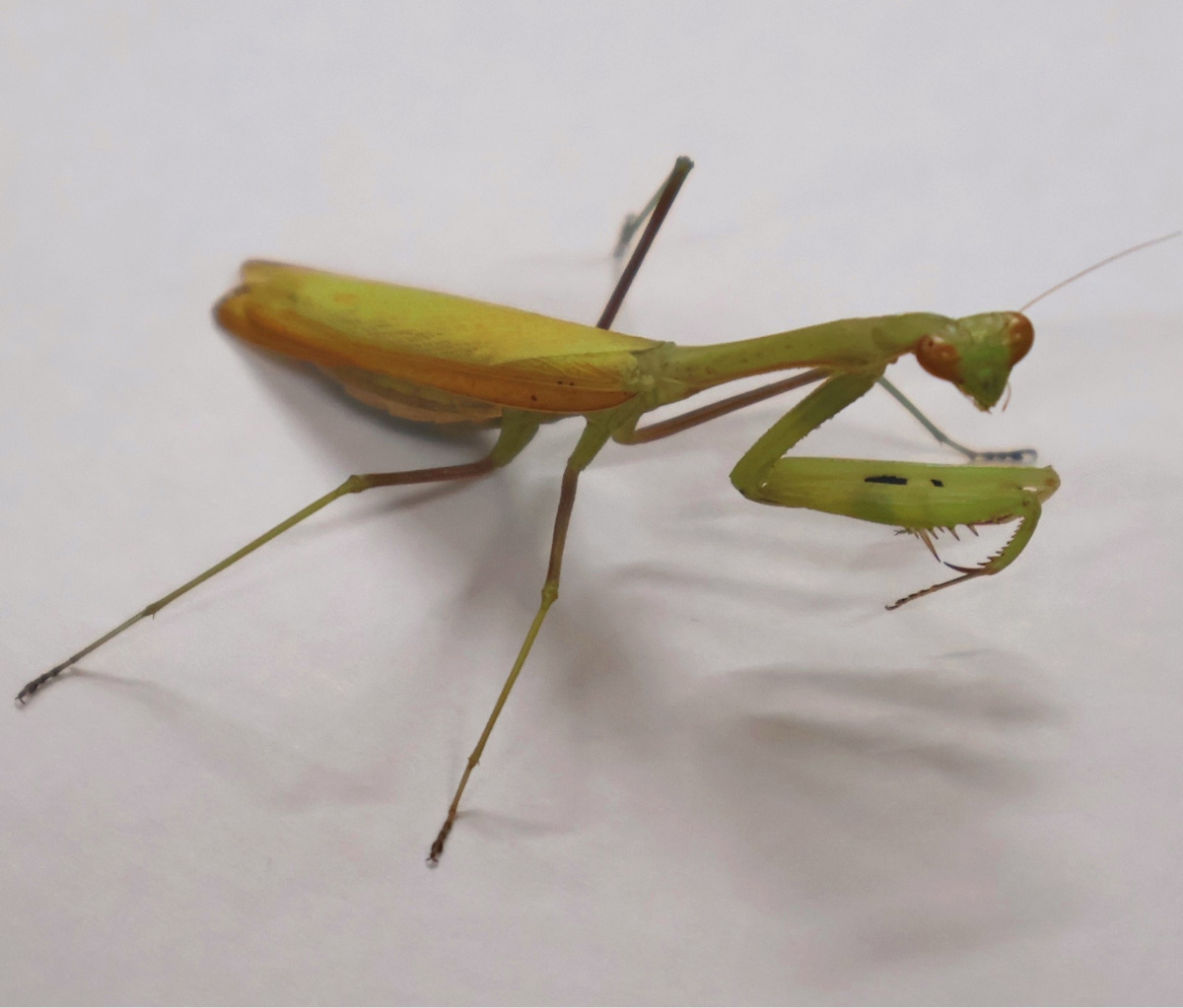 コカマキリは、枯れ葉色(茶色)の小ぶりのカマキリ。体長は4〜5cmほどで、前脚の鎌の内側に黒い模様が付いているのが特徴。