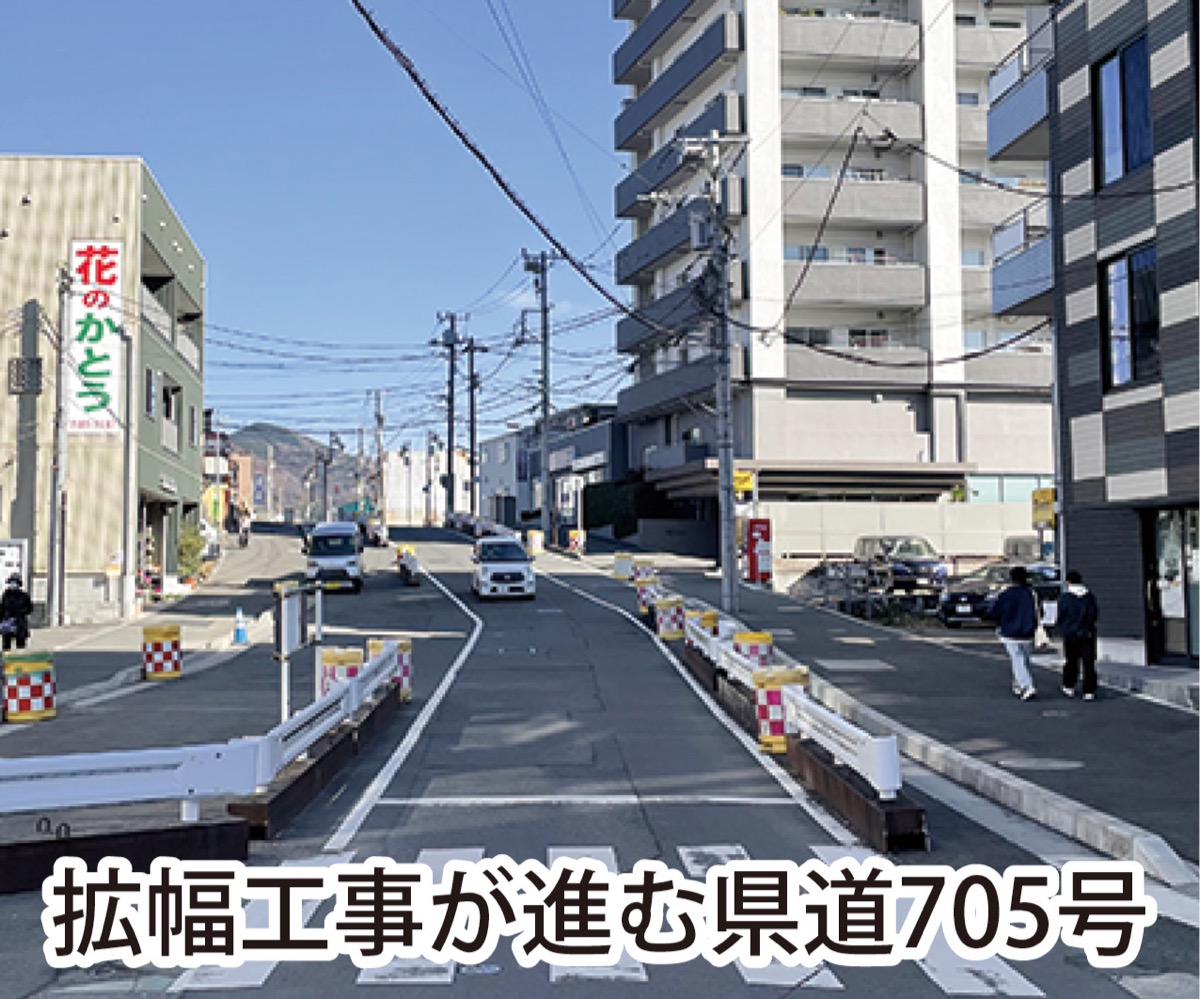 現在、県道705号のまほろば大橋から片町交差点までの約250m区間で、一方通行から対面通行への道路拡幅事業が進められております。