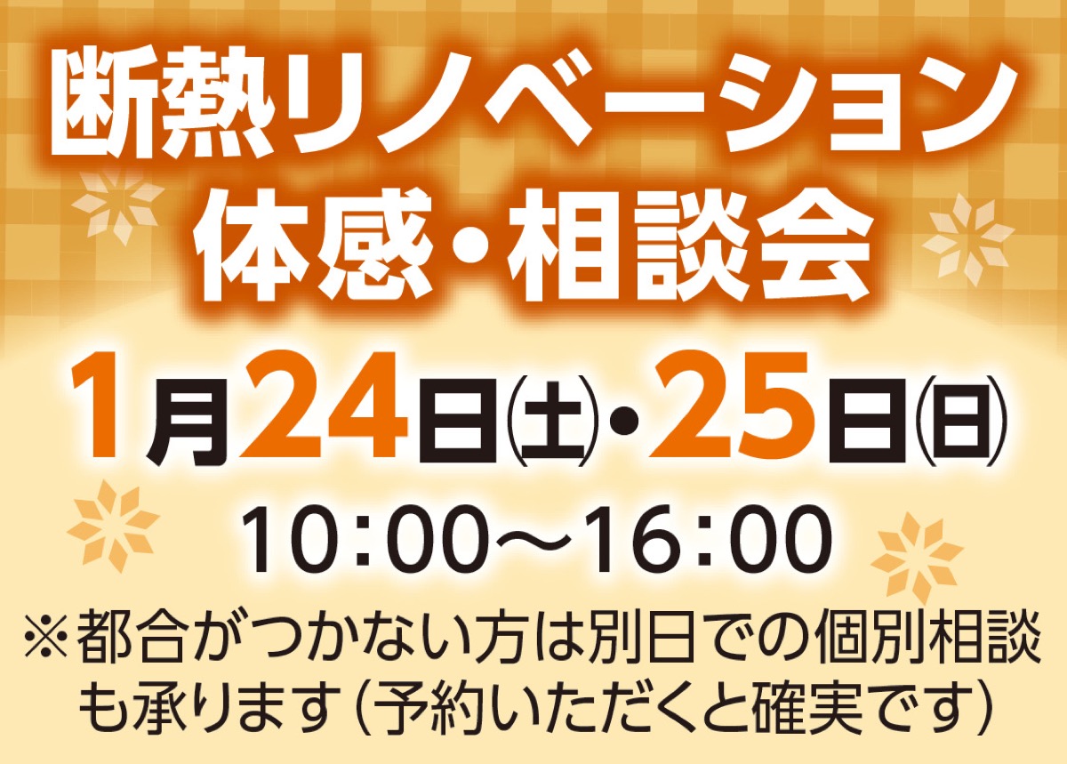 1月24日(土)・25日(日)には、同スタジオで断熱リノベーション体感・相談会を実施。断熱効果を体感できるほか、最新設備なども見学できる。断熱リノベをするなら補助金活用も可能。同社では申請をサポートしており、来年度も補助金継続が決まっているので、相談するなら今だ。キッチンや浴室・トイレの水まわりリフォーム相談のほか、土地活用などの不動産相談もできる。時間は午前10時〜午後4時。
