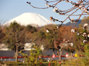 恒例となったマラソン大会の風景です。富士山と寒桜と力走するランナ—。