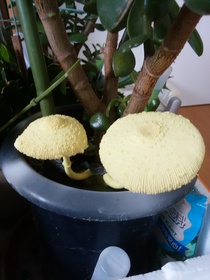 観葉植物の鉢から黄色いキノコ顔出す