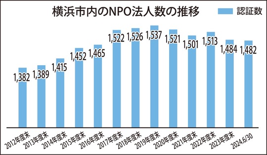 横浜市内のNPO法人数は2007年3月には896団体だったが、翌年には1千団体を突破。以降も毎年増加していたものの、2019年10月末の1542団体をピークに減少傾向に転じ、今年6月末現在で1482団体となっている。