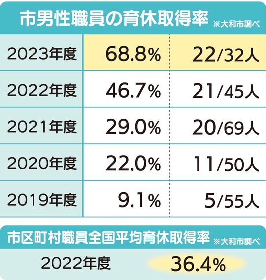 大和市が男性職員を対象に実施する「育児応援プロジェクト」は、2024年10月で開始から2年が経過した。23年度は新たに育児休業が取得可能となった男性職員32人のうち、22人が育休を取得し、育休の取得率は68・8%で前年度の46・7%から22・1ポイント上昇した。