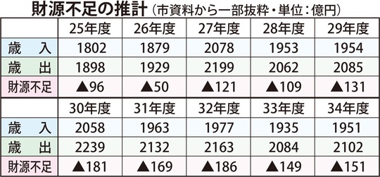 市資料によると、新たな推計では歳入から歳出を引いた財源不足について25年度は約96億円、26年度は約50億円を見込む。前回推計は26年度に約142億円の不足を見込んでいたことから、歳入は増加傾向となっている。市財政課では「景気の持ち直しによる市税の増加が推計を上回っている」と分析する。