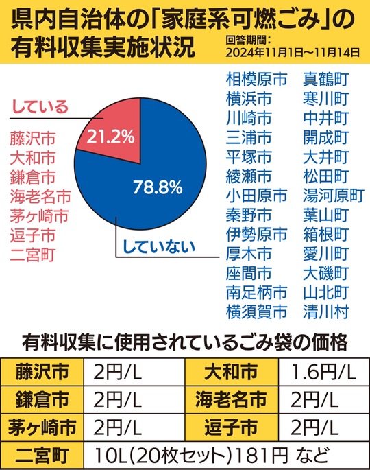 家庭系可燃ごみの有料収集(※1)を行う神奈川県内の自治体は2024年11月14日現在、6市1町あり、県内33自治体に占める割合は21%であることが、タウンニュース社のアンケート調査で分かった。国は有料化を推進しており、22年時点で全国の実施率は62%(※2)。