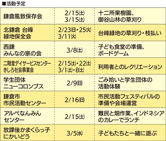 対象は市内在住・在学の中高生。ボランティアの受け入れに鎌倉風致保存会、北鎌倉台峰緑地保全会、西鎌みんなの家の会、二階堂デイサービスセンターを運営する社会福祉法人きしろ社会事業会、学生団体ニューコロンブス、鎌倉市市民活動センター、NPO法人アルぺなんみんセンター、放課後かまくらっ子にかいどうの8団体が協力。ごみ拾いなどを実施する2月9日(日)のニューコロンブスを皮切りに、山林の草刈り、高齢者とのレクリエーション、紛争や迫害によって故郷から逃れてきた難民との畑作業、学童の小学生との交流など3月中旬まで各所で活動が展開される。