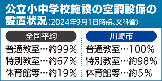 猛暑による熱中症対策や防災拠点となる避難所の安全を確保しようと、川崎市議会は先月、公立学校の体育館などへの空調設備の整備促進を求める決議案を全会一致で可決した。国も整備に向けた財政支援の拡充を表明。市内の学校体育館への設置率は約5%にとどまっており、状況改善に期待がかかる。