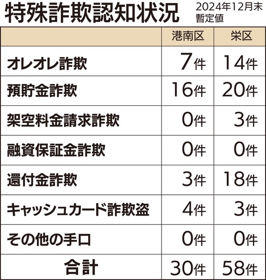 市内の他区比較では件数は6番目に多く、被害額は4番目に少なかった。昨年比での被害額減少について、栄署担当者は「1件多額な被害があるだけで大きく変動することもあるが、そうした被害があまりなかったことが要因」と話した。