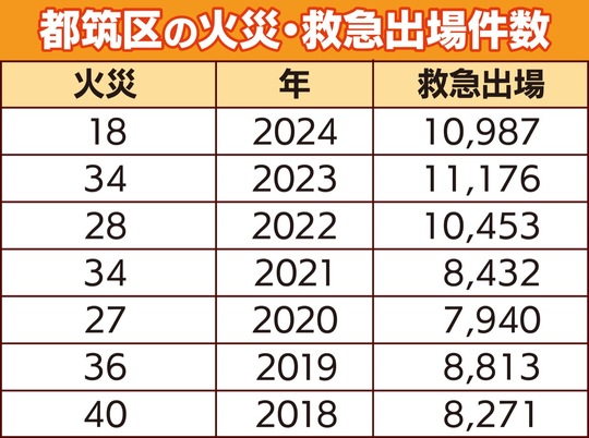 都筑消防署総務課予防係によると、2024年に区内で発生した火災件数は18件、救急出場件数は1万987件で、どちらも前年より減少する結果となった。同課担当者は「引き続き、火の元への注意と救急車の適正利用を」と呼びかけている。