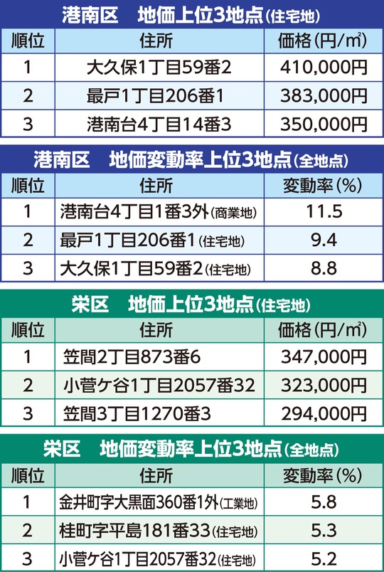 栄区の全地点を変動率順で見ると、1位は工業地の「金井町字大黒面360番1外」で5・8%の上昇。続いて、5・3%の住宅地「桂町字平島181番33」、次いで住宅地で2番目に高い「小菅ケ谷1丁目2057番32」が5・2%となっている。