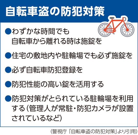 犯行が行われた時間帯は夜間に集中しているといい、町田署の江口博行署長は「自転車ぐらい、という安易な気持ちで盗む人が多いようだ。窃盗罪にあたる。無施錠の自転車が狙われる傾向だ。注意してもらいたい」と呼びかける。