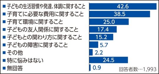 「子育てに関する心配ごと・悩み」=図=への設問では、0〜6歳児の保護者の38・5%が「子育てに必要な費用に関すること」と答え、前回調査の15・4%の2倍以上だった。小・中学生の保護者は「学習・進学・受験に関すること」が多く、小学5年生の保護者の6割、中学2年生の保護者の7割を占めた。