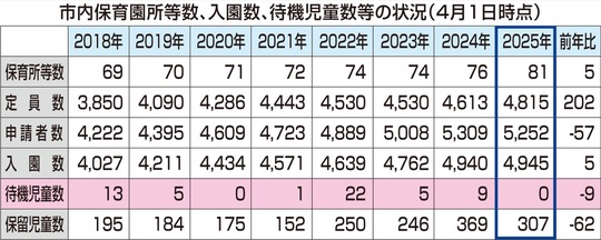 また、市こども育成部保育課担当者は「定員数の増加に比べ入園数の増加がやや少ないことが例年にはない特徴」と話す。その理由について、新設された施設は1年目は埋まらない傾向があること、保育士の確保が厳しさを増しており、既存施設の入園数が昨年より70人減少していることなどが要因とみている。