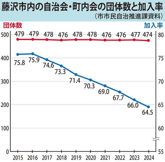 広報物の配布や防犯啓発、資源ごみ回収の収集所運営などを担う自治会・町内会。市民自治推進課によると、市内の団体数は474。近年大きな増減はないのに対し、加入率は64・5%(昨年9月時点)で1980年度の96・4%をピークに、2016年度の75・9%から減少が続く。