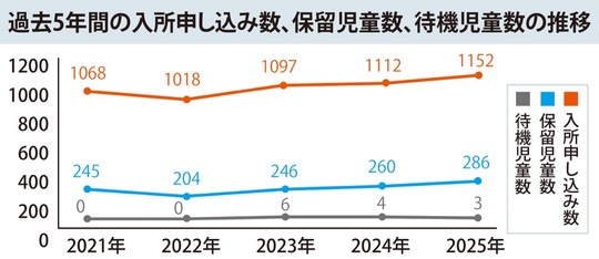 保留児童は2022年が204人、23年が246人、24年が260人、25年が286人と年々増加している。286人の内訳は、育休の延長が142人で最も多く、次いで特定の保育所を希望が90人、求職活動中が42人だった。