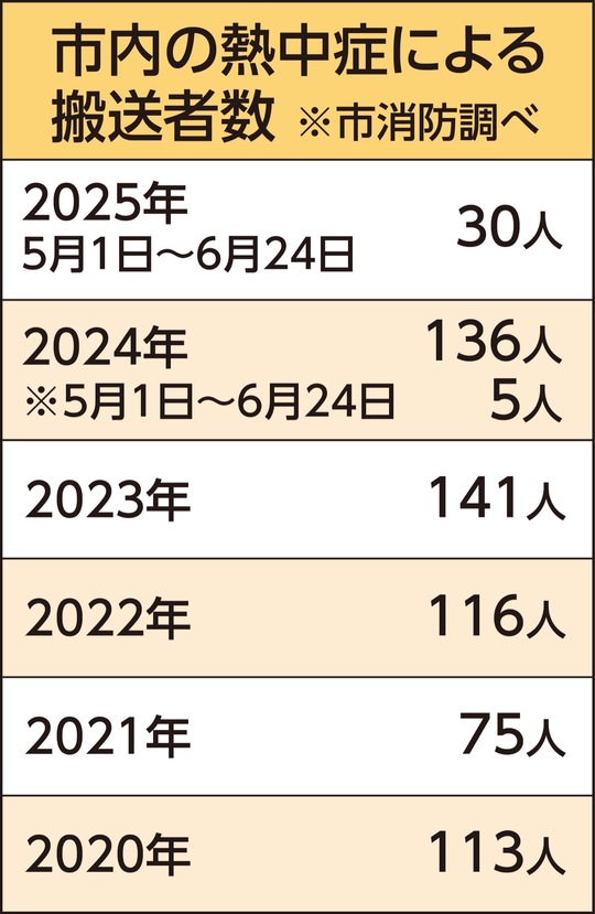 今年5月から6月24日までに熱中症で救急搬送された人の数が、昨年の同時期と比べ25人多い30人に上っていたことが本紙の調べでわかった。ますます気温が上昇していく7月以降に向け、市では熱中症に対する警戒と予防への意識を高めるよう呼びかけている。