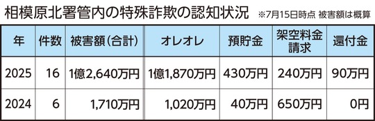 相模原北警察署管内で特殊詐欺の被害が急増している。今年(7月15日時点)の認知件数は16件で、被害額は約1億2640万円になる。前年同時期と比較して1億円以上増加しており、同署では注意を呼び掛けている。