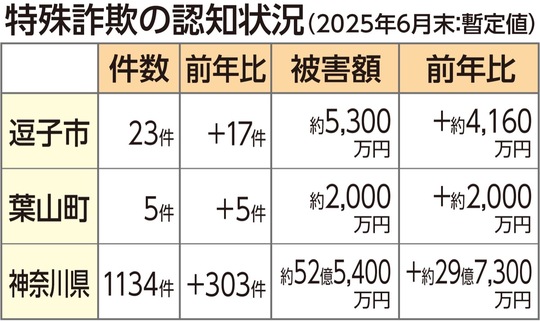 今年1月1日から6月30日までに神奈川県内の特殊詐欺認知状況は1134件(前年比プラス303件)、被害額約52億5400万円(同プラス約29億7300万円)。主な手口はオレオレ詐欺、預貯金詐欺、還付金詐欺、架空料金請求詐欺の順に多い。金額だけで見ると2023年1年間の約46億900万円を既に超えている。