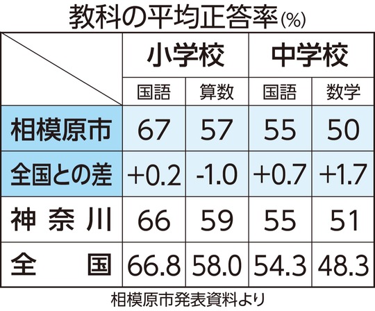 相模原市では、小中学生ともに国語の正答率が全国平均を上回る結果となった。昨年度は小学生の国語が全国平均より0・7ポイント低かった。市教育委員会の担当者は、今回の結果には市が進めている「3つのじ」などの取り組みが起因していると推測する。