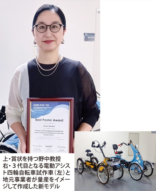 台湾の高雄市で開催された家電など民生用電子機器の国際会議「IEEE ICCE-TW2025」で湘南工科大学工学部機械工学科の野中誉子教授が「ベストポスターアワード」を受賞した。内容は、同教授が取り組みを進める電動アシスト付き四輪自転車について。「とてもうれしい」と喜びを語った。