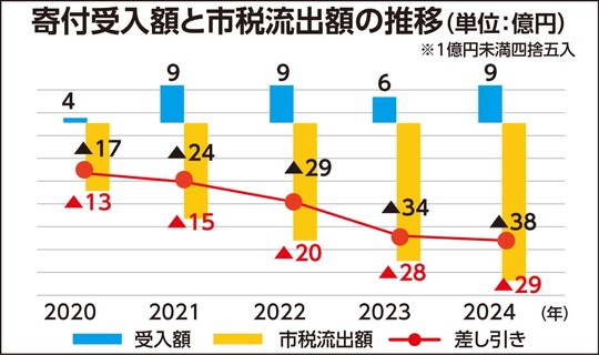 ただ、寄付受け入れ額と流出額の差額は前年度から約2億円増えて約29億円。その差は拡大を続けている。