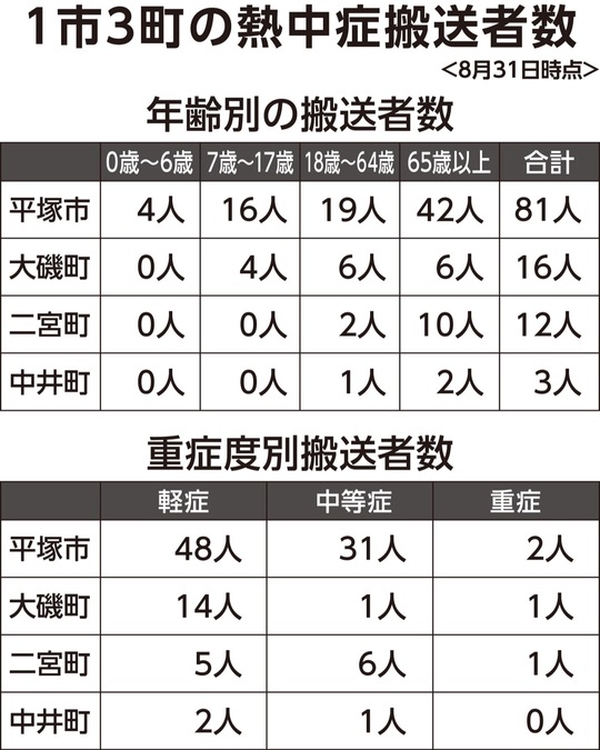 各消防本部によると、1市3町の救急搬送者数は、平塚市が81人、大磯町が16人、二宮町が12人、中井町が3人だった。平塚市消防本部消防救急課によると、「6月17日ごろから搬送者の数が継続的に増加した」という。8月31日までに搬送された81人のうち、年齢別では65歳以上が42人で最も多く、18歳〜64歳が19人、7歳〜17歳が16人、6歳以下が4人だった。