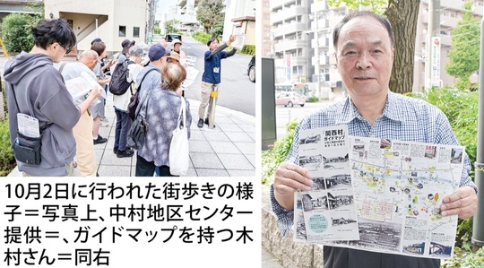 関東大震災から100年の節目となった2023年から関西村の存在を知ってもらうため、街歩きやパネル展を実施。さらに認知を広げようと今年、中村地区センターの岡泉副館長がガイドマップ制作を提案し地域のデザイナーの協力を得て、作成した。木村さんは「関西村や大変な時に助けてもらった事実を広く知っていただくための一つの道具として活用していきたい」と話した。