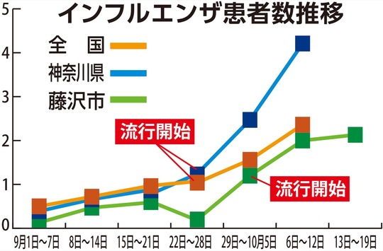 藤沢市は8日、インフルエンザの流行が始まったことを発表した。9月29日〜10月5日に流行の目安となる基準を超え、昨年11月上旬の開始と比べ1カ月以上早い。今後さらに感染が広がることが予想され、予防・対策が急務だ。