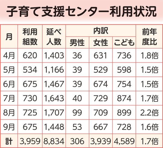 同センターには9月末までに3千959組が利用。述べ人数では8千834人が利用した。平均利用者は前年度の1・7倍増になり、特に8月は夏まつりイベントなどの効果もあり2・2倍(前年度比)増になった。市こどもみらい課の担当者は「建物がきれいになり、明るくなったことに加え、広さは2倍に。さらにこども用トイレや授乳室など来場しやすい環境が整ったことが大きいのでは」と分析する。また市内在住の利用者に加え、市外からの来場者も増加傾向にあり「利用者増は喜ばしいが、対応の不備が起きないよう人員の配置の検討も必要になるのでは」と話す。