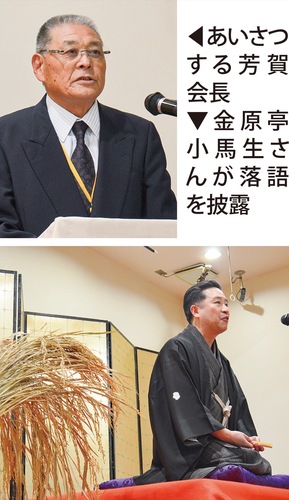 芳賀会長は石田さんに感謝を伝えたほか、『人生で一番の財宝は健康に勝るものはなし』という言葉を引用し、健康寿命の延伸に触れ「これからも感謝と絆、思いやりを忘れず一層努力を重ねていく」とあいさつ。大山阿夫利神社の新穀感謝祭に米を奉納することも語った。また金原亭小馬生さんが落語を披露し、会場を笑いの渦に巻き込んでいた。