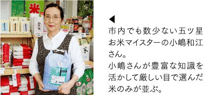 宮前区犬蔵のお米専門店「ヤマイチ」。常に上質な美味しい米が並ぶ同店のこだわりは、信頼できる農家から直接仕入れる心のこもった〝心米〟を提供すること。五ツ星お米マイスターとして農家との関係づくりからキャンペーン企画、販売までこなす小嶋和江さんが中心となって切り盛りする同店は工夫を凝らした米の販売も魅力のひとつ。「質の高いお米を提供するのはもちろんのこと、健康や好みに合わせて楽しく美味しく召し上がっていただけるよう常に考えています」。