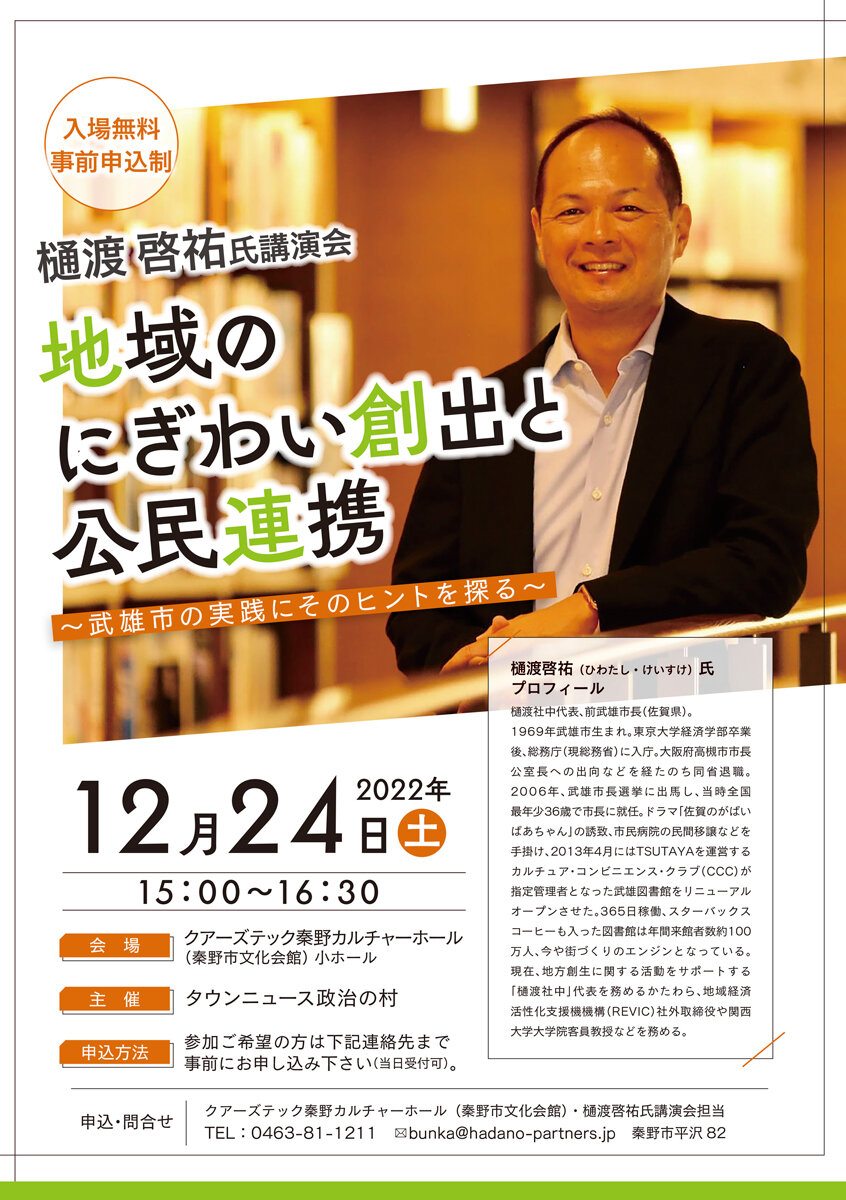 申し込み方法は、クアーズテック秦野カルチャーホール(秦野市文化会館)・樋渡啓祐氏講演会担当