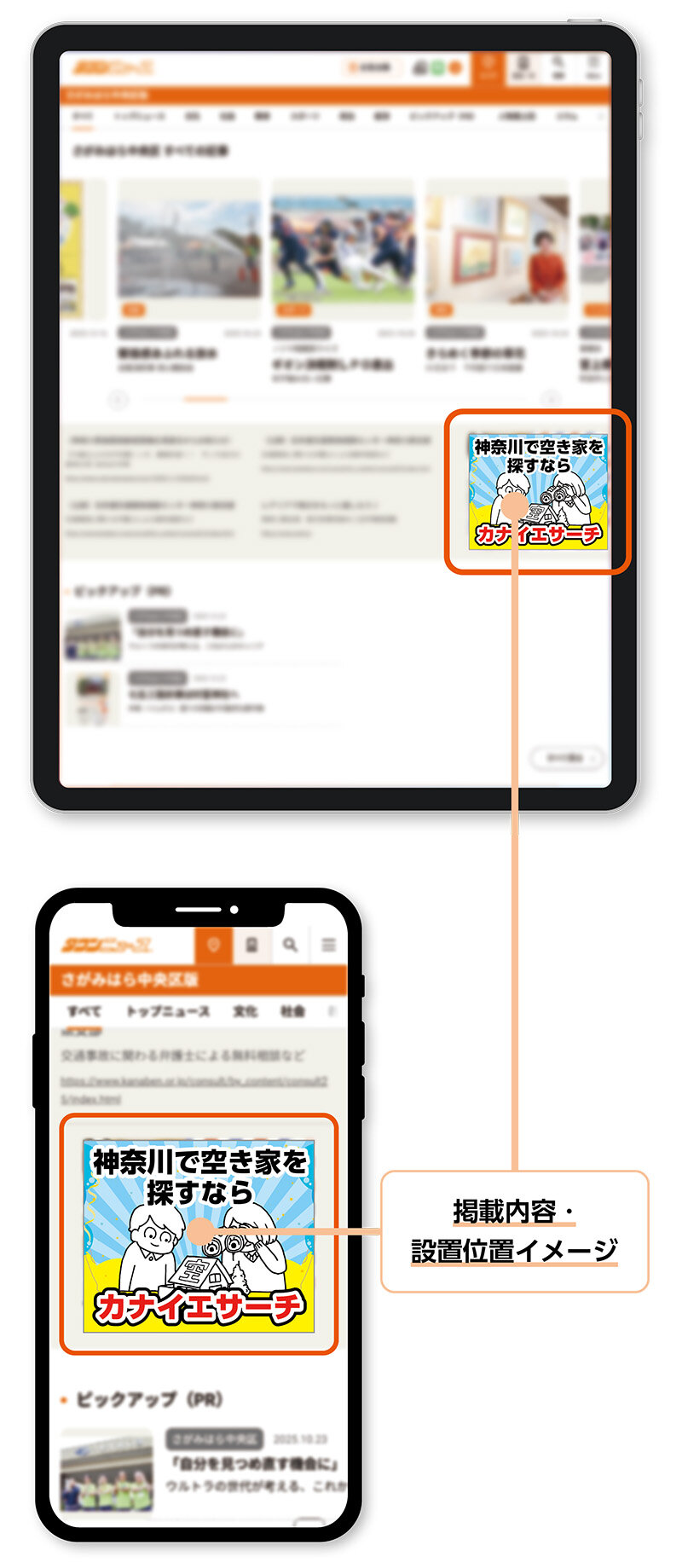 Web版タウンニュースにバナー広告を掲載します。パソコン用はエリアページ右側のファーストビューで表示されるエリア。スマホ用はエリアページのトップニュース等タブ表示エリアの下に表示されます。概ね1スクロール以内で表示されます(機種による)。
