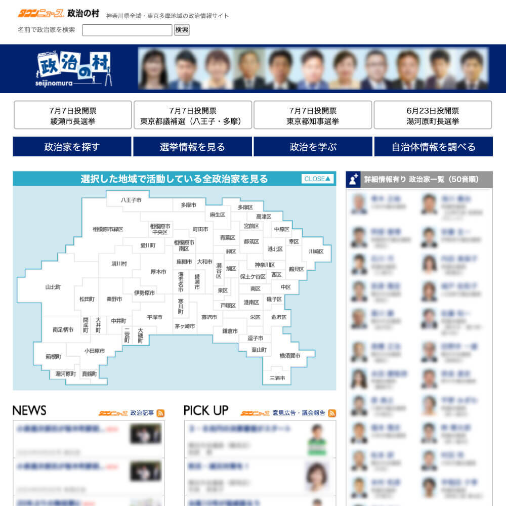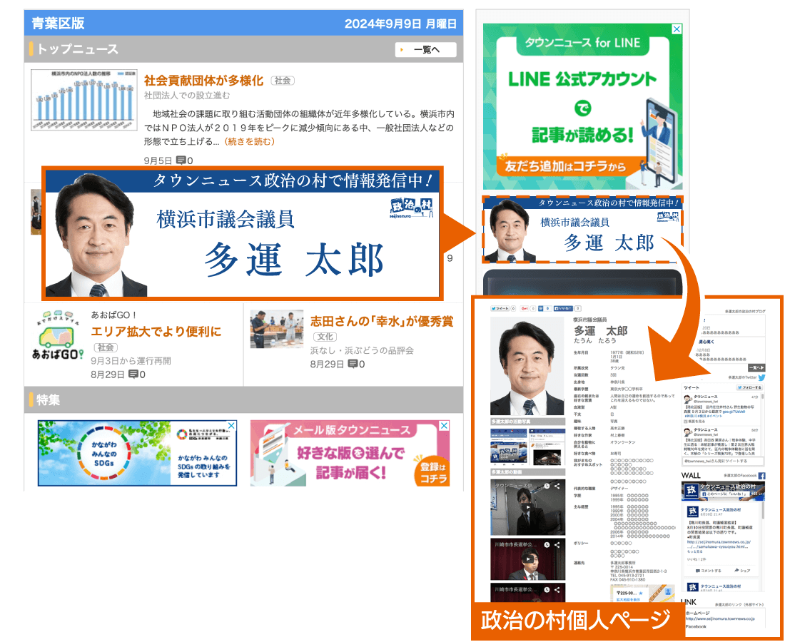 活動地域に該当するWeb版タウンニュースのエリアトップページにバナーを表示いたします(※最大4エリア)。バナーのリンク先は政治の村個人ページとなります。
