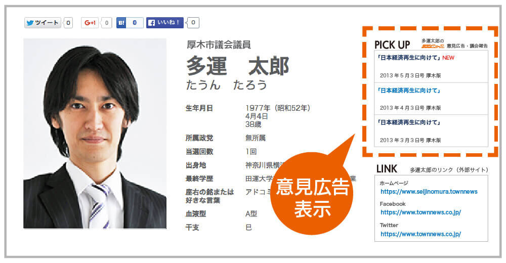 メインコンテンツとなる政治家のプロフィールページでは、政治家の基本的なプロフィールと意見広告を無料で掲載。
