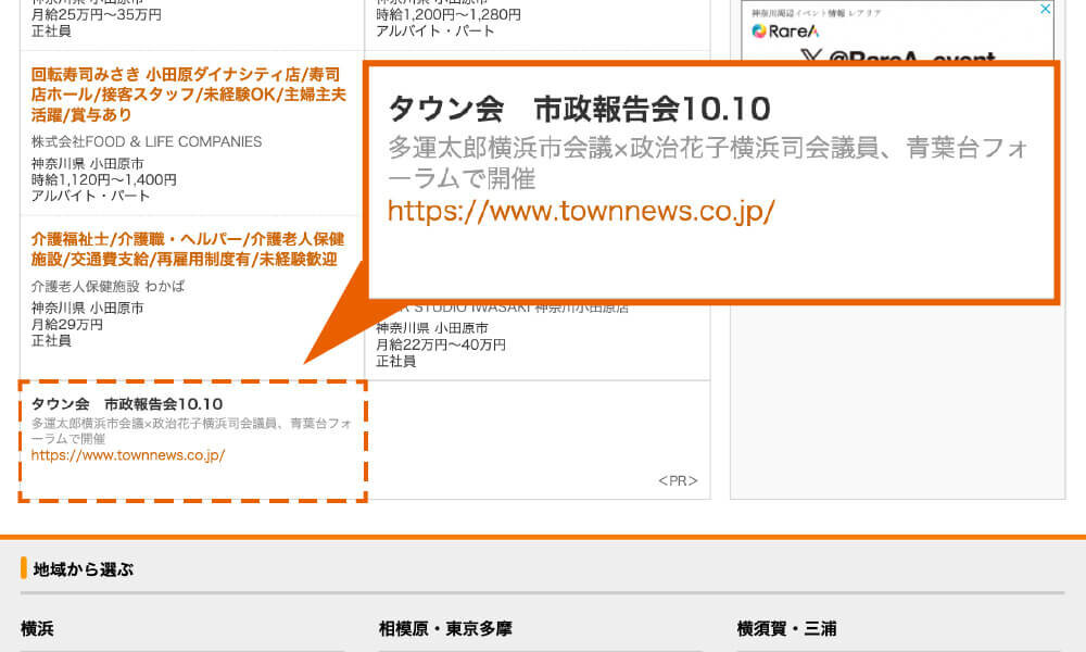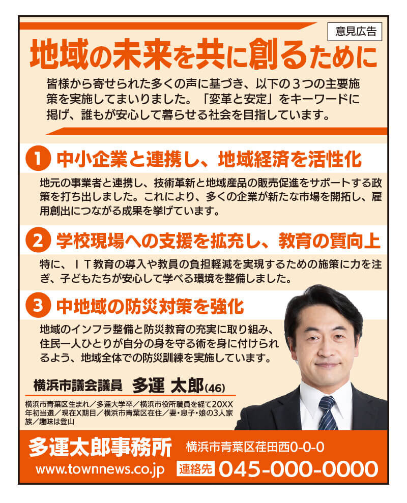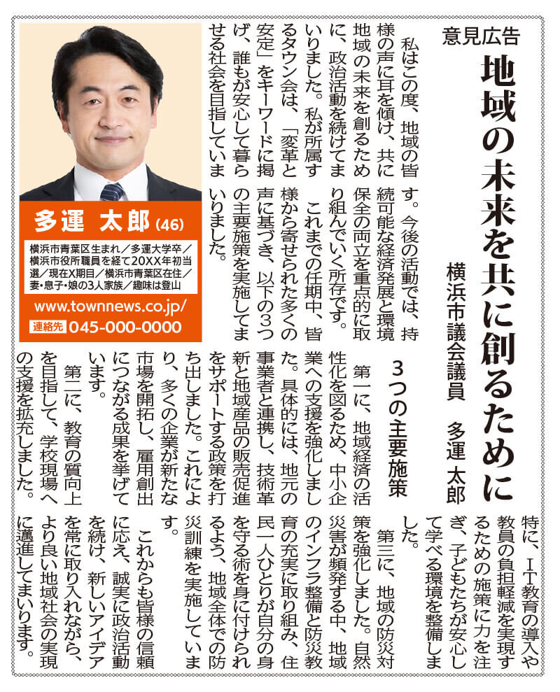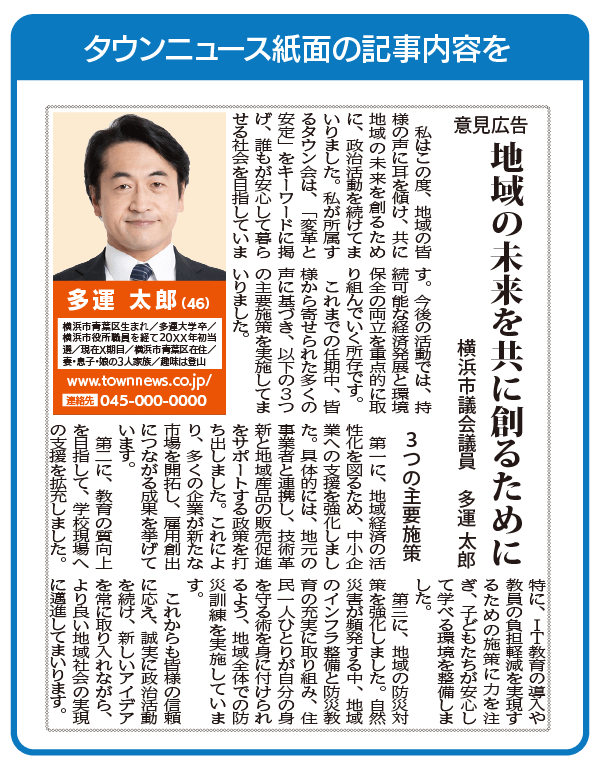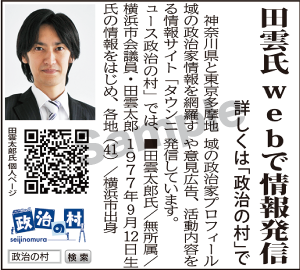 政治の村で詳細情報を発信していることをタウンニュースの紙面で広告枠4回掲載(16万円相当)。