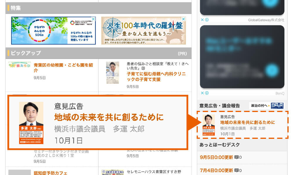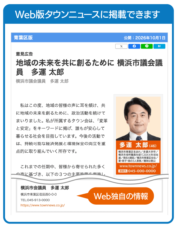タウンニュースのWebサイト「Web版タウンニュース」は、全地区の記事を網羅した情報満載のニュースサイト。紙面広告掲載料金+22,000円(税込)でWeb版タウンニュースに意見広告を掲載でき、さらに政治の村個人ページにも意見広告が表示されます。