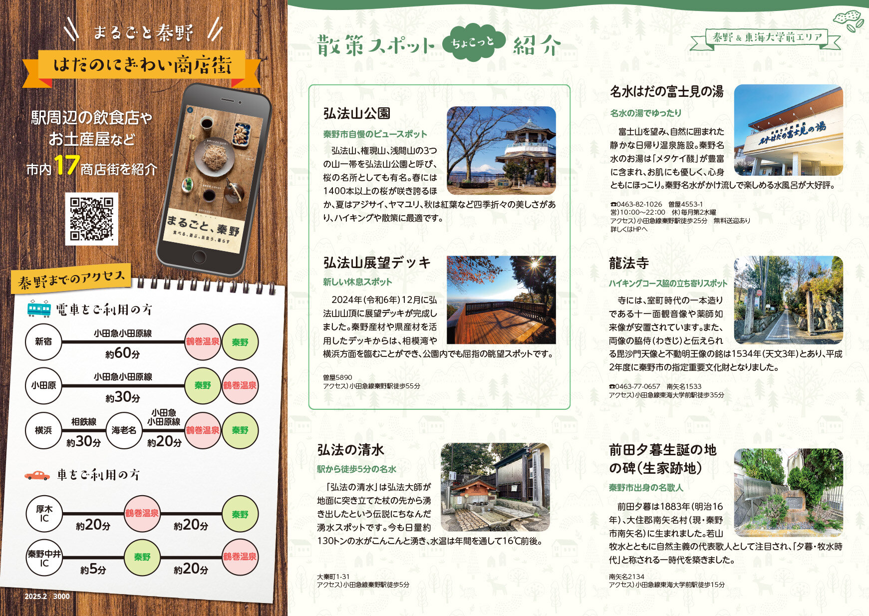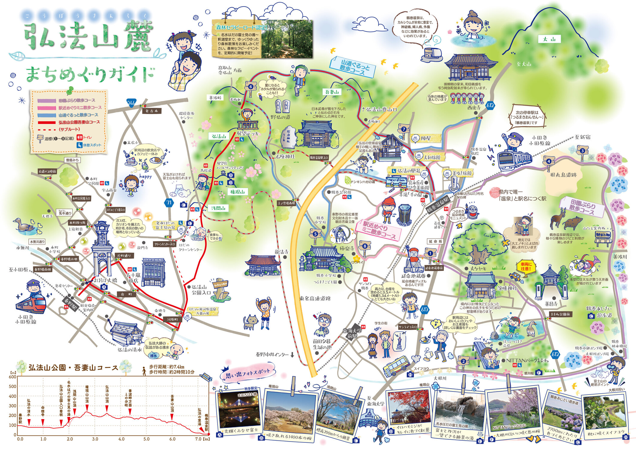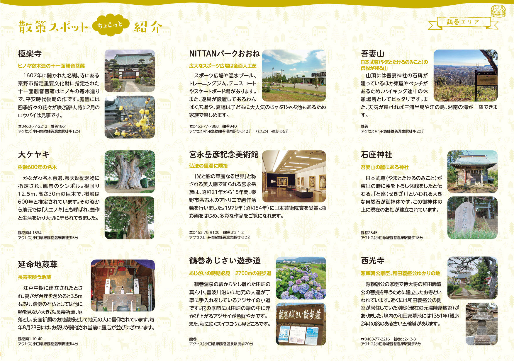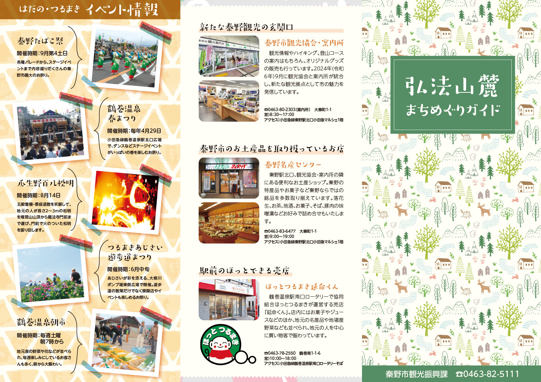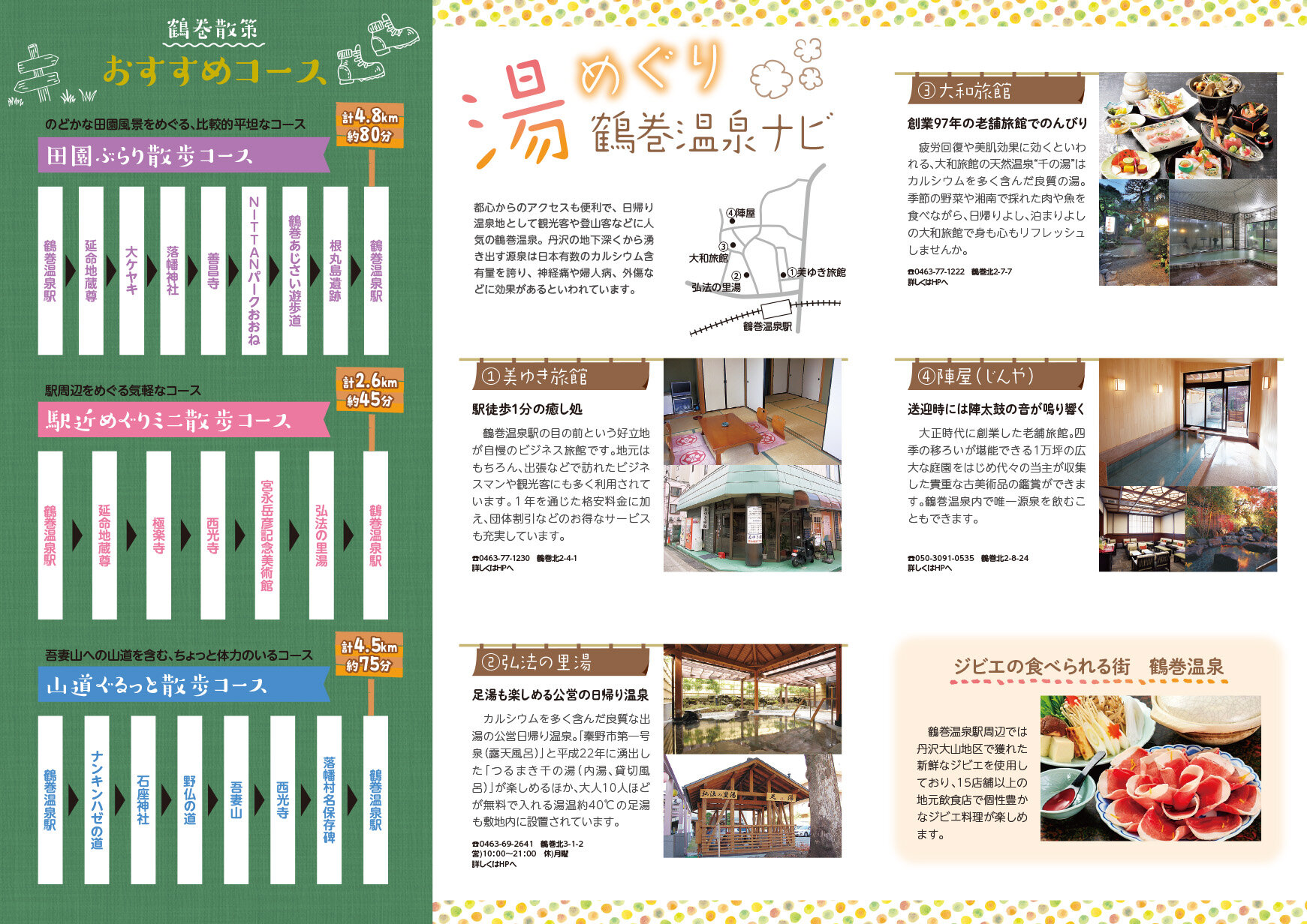 - 秦野でも人気の高い低山ハイキングコースの周辺を紹介したリーフレット。吾妻山、弘法山、権現山、浅間山の低山をめぐるコースのほか、鶴巻温泉駅、秦野駅周辺の観光スポットなどを紹介。手に取ってもらった人に親しみをもってもらえるようにと、観光スポットなどをイラストで描き起こし、紹介をしています。 数年ごとに見直しを図り、内容を更新しています。