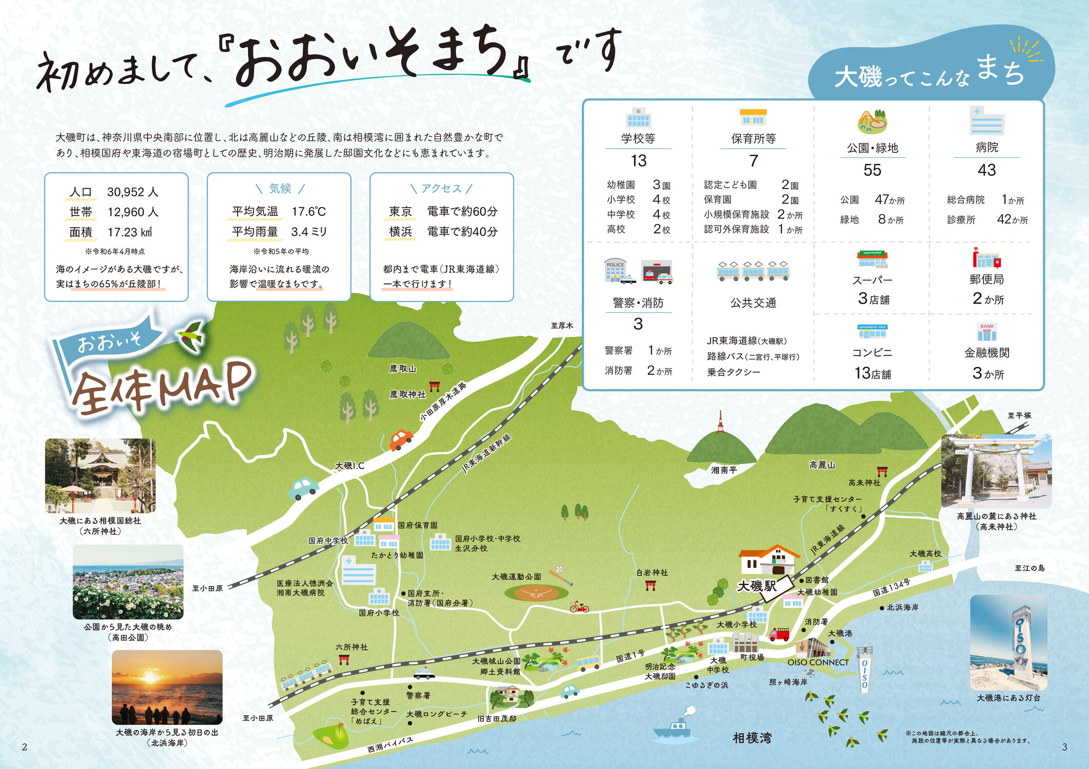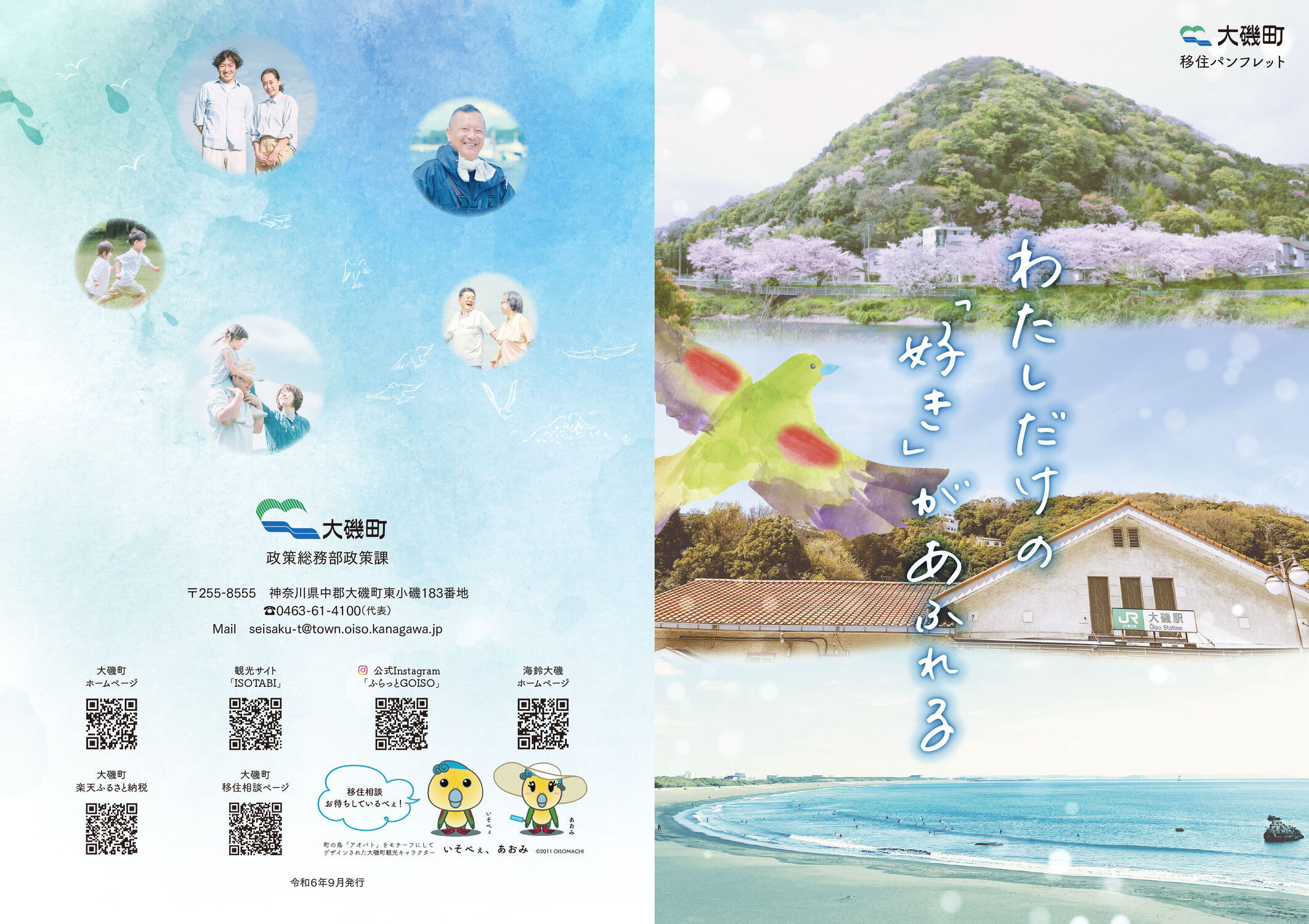 移住定住促進事業の一環としてパンフレット制作。行政が参加する移住定住促進のイベントで配布された。アオバトのイラスト(タウンニュースで作成)など、地域の特色にこだわり、また大磯の持つ自然豊かで文化的な特徴が伝わるように写真をふんだんに使用した。映画のワンシーンのようなイメージで作成した。