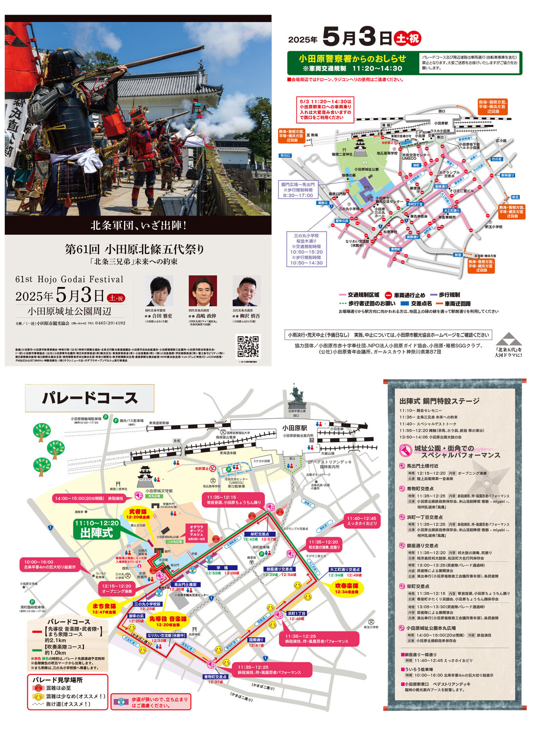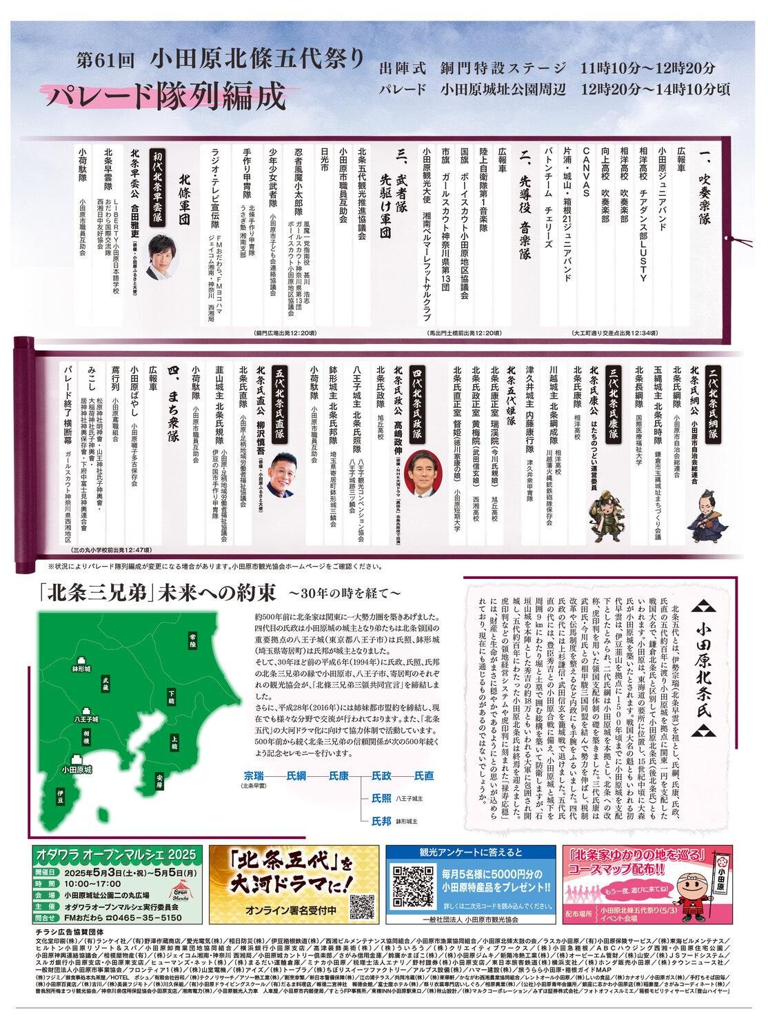 - 戦国時代に5代、100年にわたり小田原を治めた「北条氏」の栄華を今に伝える、小田原市最大の観光イベント。新聞折込や会場等で配布されたチラシは、イベントスケジュール、パレードコース、会場マップやなどを分かりやすく表記しました。
