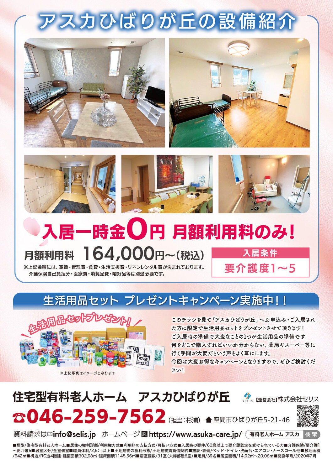 株式会社セリス(本社/平塚市)が展開する住宅型有料老人ホーム・アスカシリーズを紹介。平塚市松風町にある新施設のオープンと入居者募集のチラシでは、明るく解放感たっぷりの施設であることや安全・安心であることなどが伝わるよう、写真を効果的に使い、デザインしました。新聞折込の手配も当社で行いました。