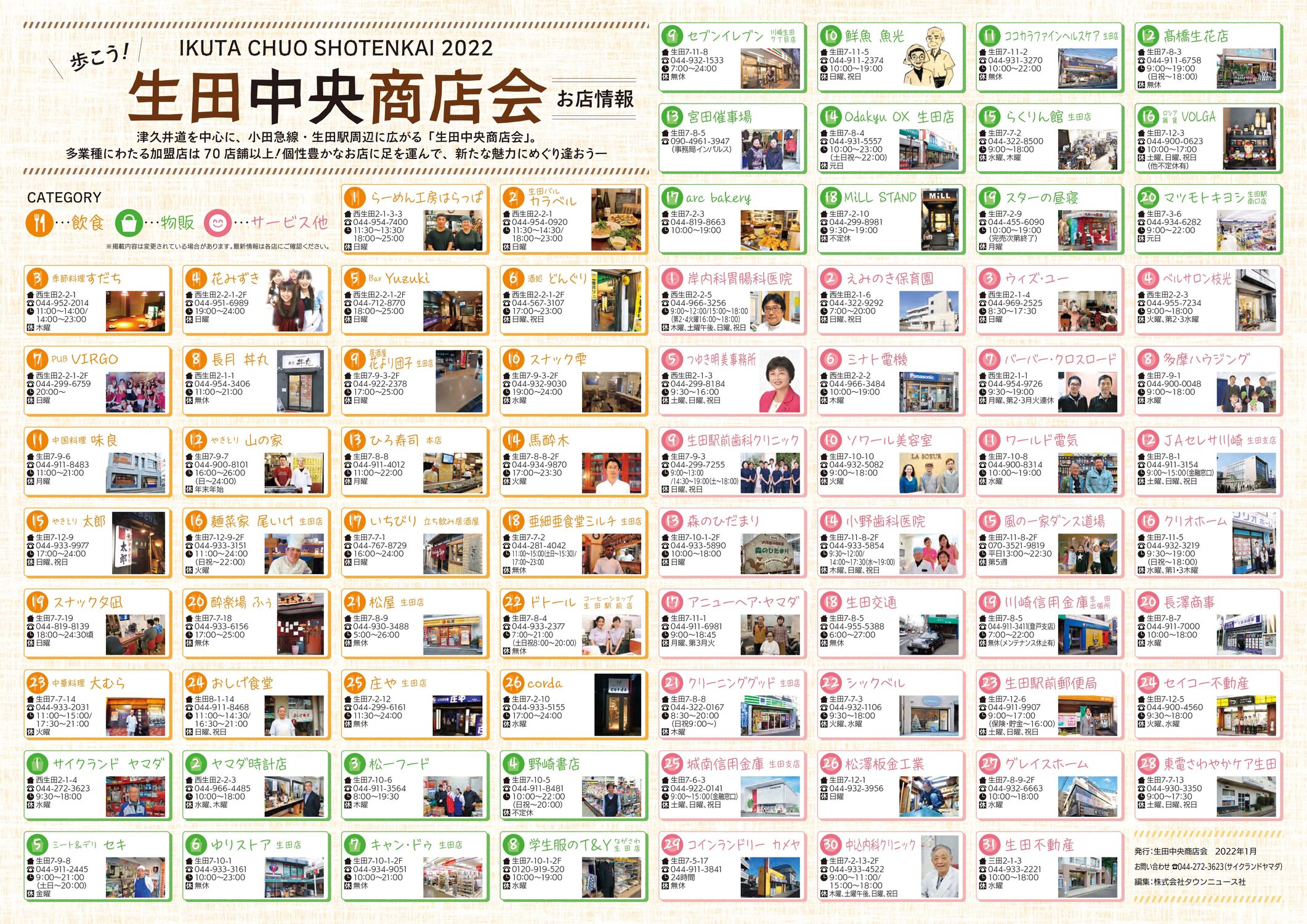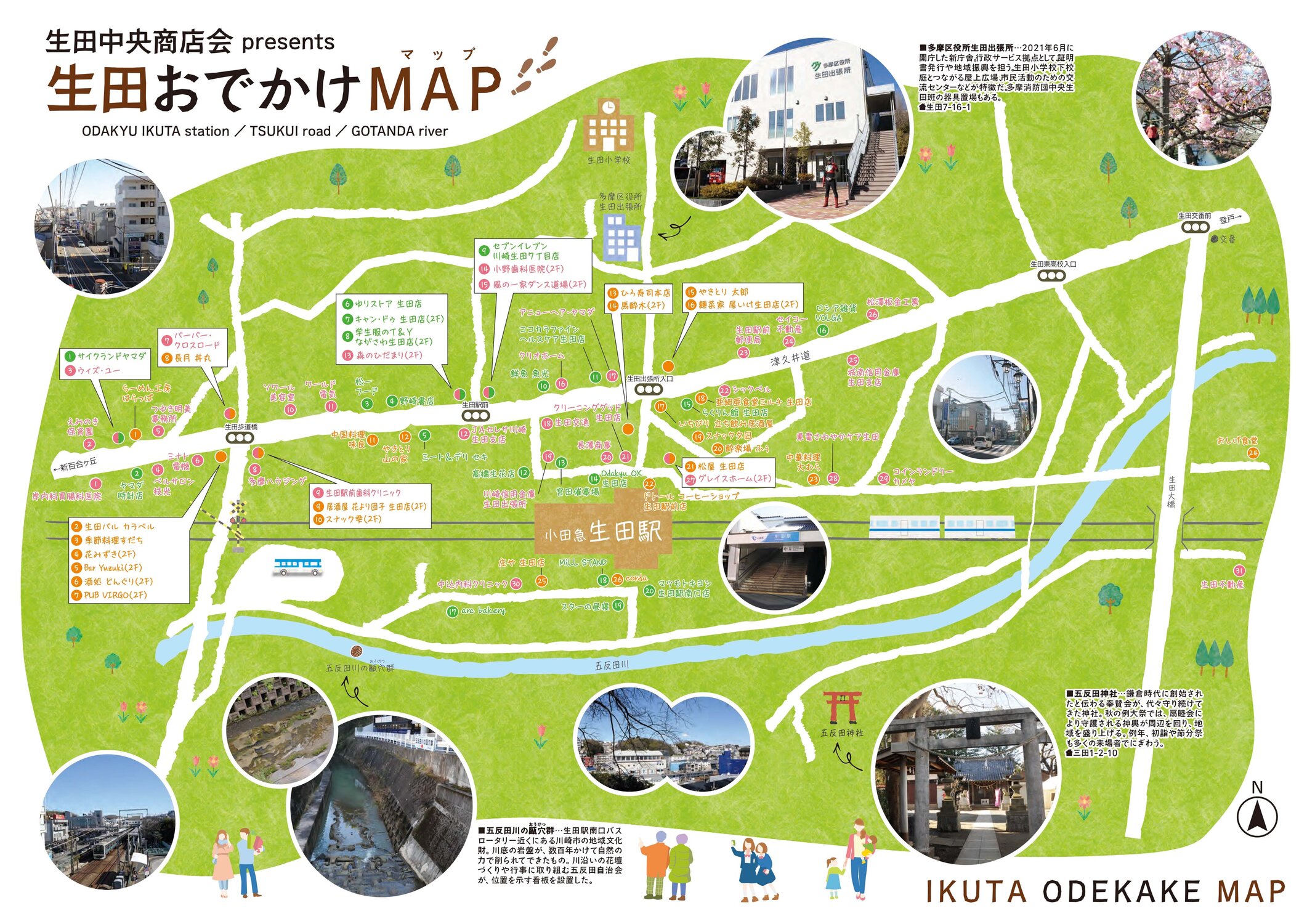 小田急線生田駅北口に直結する商店街、生田中央商店会のお店を紹介したリーフレット。表面で70店を超える加盟店をPR。裏面で各店舗の場所をイラストマップで表記し、五反田神社、五反田川の甌穴群などの名所・旧跡や区役所出張所なども記されています。各加盟店で用意されている他、発行日には1万部を新聞折込で配布しました。